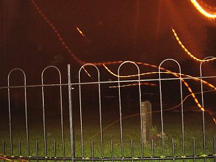 This image, taken at Quedgeley churchyard in December 2005, contains a number of competing effects. The environment is well lit, so these light streaks are likely to be the same kind of camera-induced effect playing off these bright light sources located above the photo. But notice how the lines are broken up in this instance. The red haze is more interesting, though; not a particularly common feature of these night-time photos, even when light sources are present. Then there are a set of orbs. Quite an interesting photo, we think.
