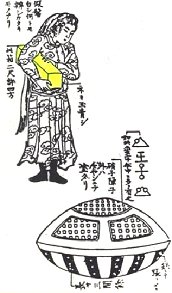 “Inside the vessel was a woman. According to the nineteenth-century classic work Dust of the Japanese Apricots by Umenosha-shujin, ‘She seemed to be 20 years old…had a fair complexion like snow and wore her excellent black hair dangling behind her back. Her beauty was beyond description.’ The woman, who was unable to communicate with her rescuers, guarded ‘a small box [power source?—GJ] and let no one come near it, for reasons unknown’.”